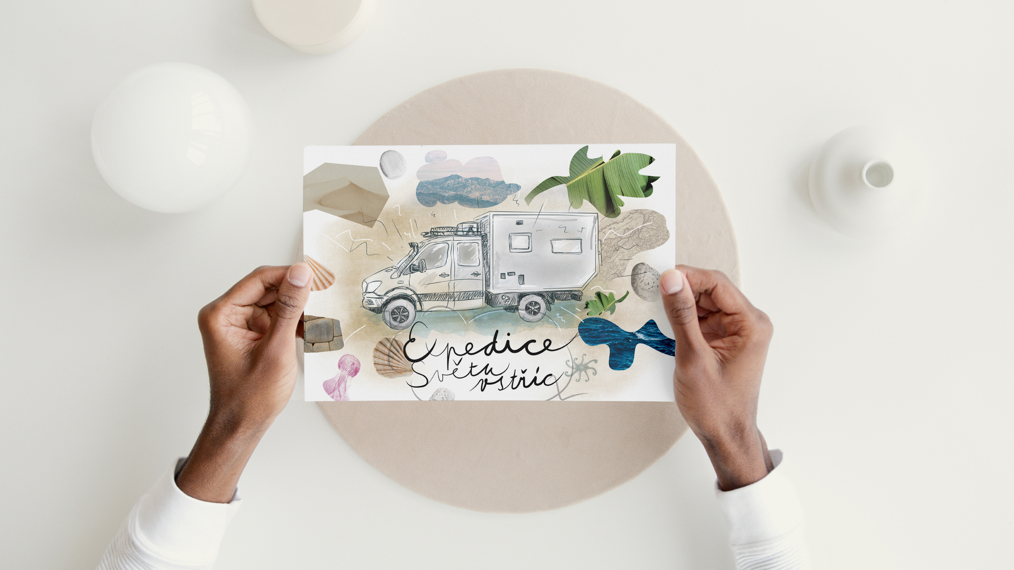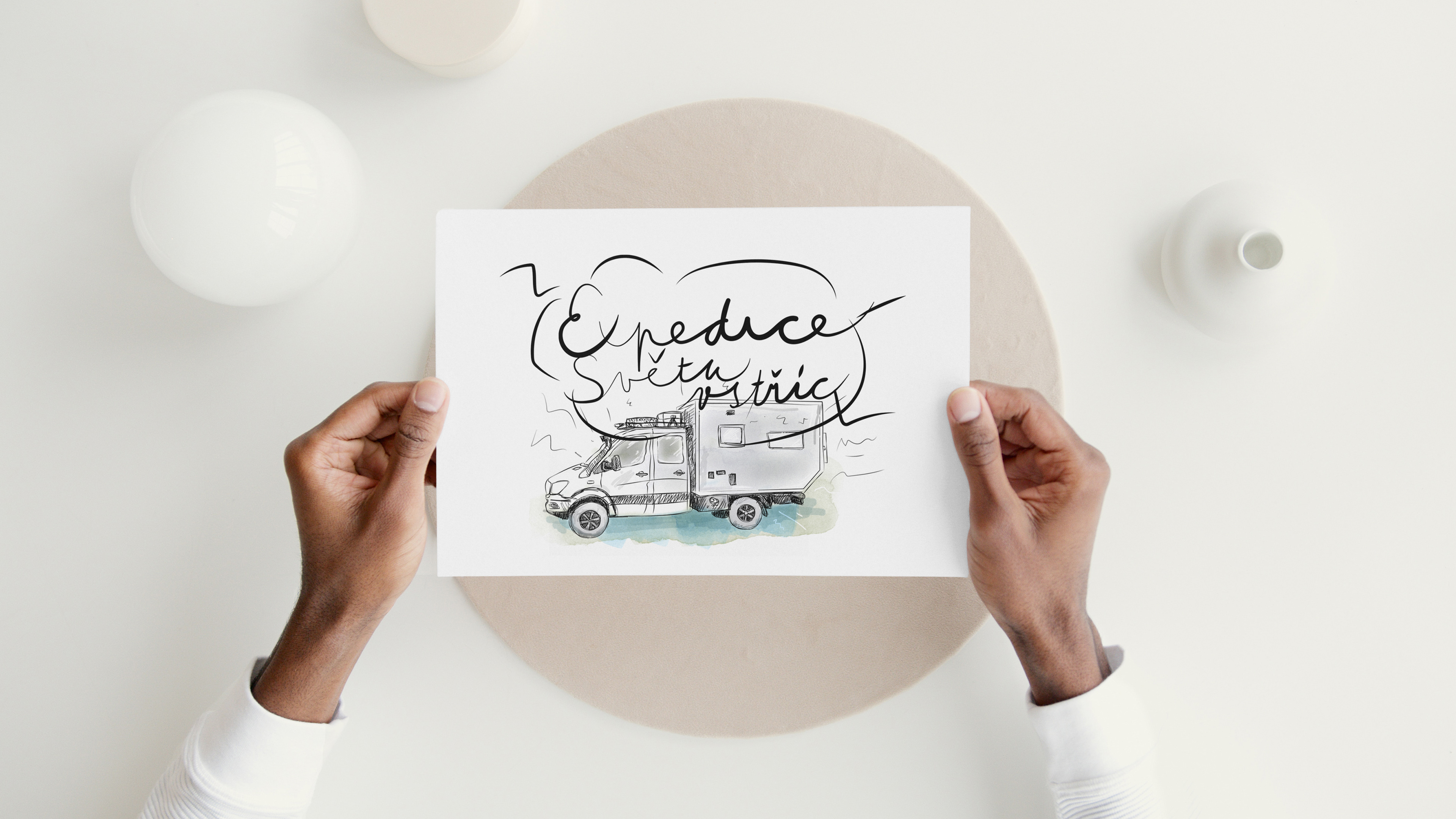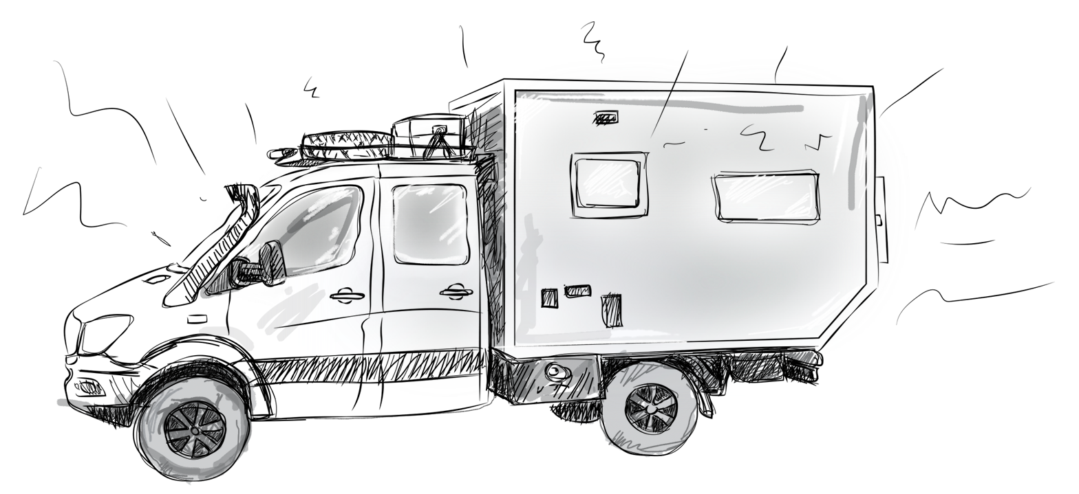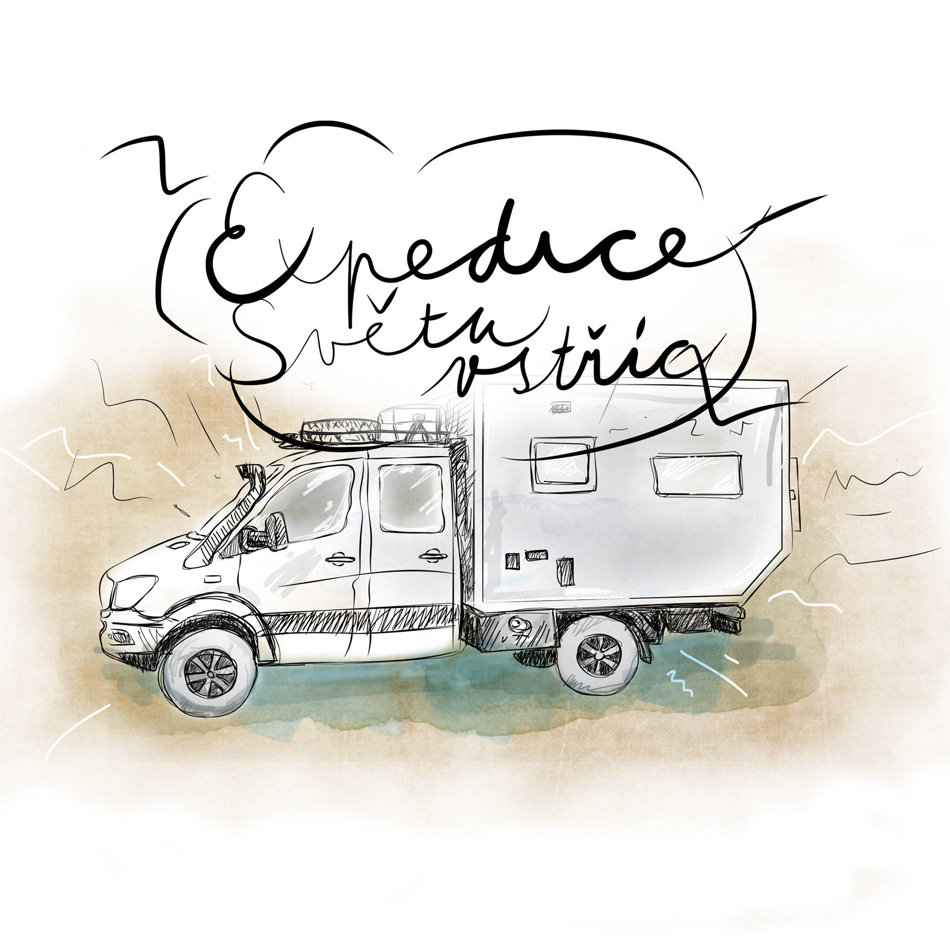Pohlednice (kresba, ilustrace) kde dostalo hlavní roli auto, které bylo domovem na cestu "Expedice světu vstříc" zde více o cestě